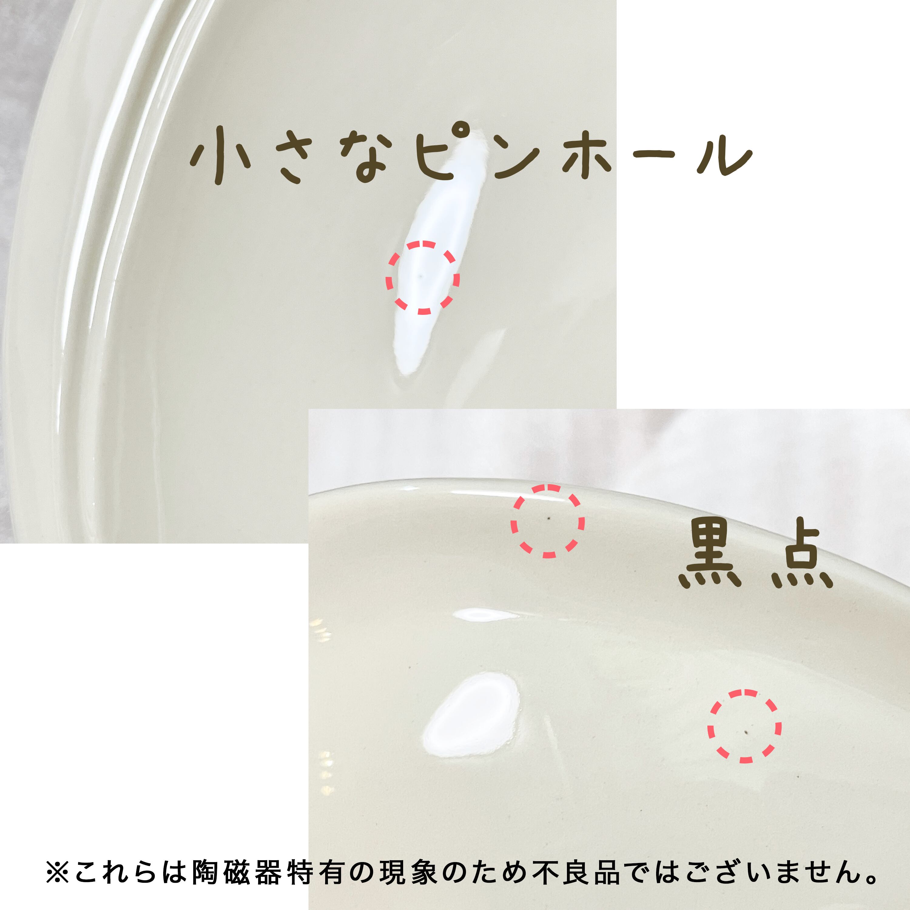 また、土の成分が泥しょうの跡として現れたり、「黒点」と言われる小さな鉄粉が表面に現れることもございます。そのほか、焼成時に微量の空気が釉薬の表面に現れ、気泡が割れることで「小さなピンホール」として跡が残ることもあります。これらの特徴は全ての器に必ず現れるわけではありませんが、「器ひとつひとつに現れる個性」となります。何卒、ご理解の上、ご利用の際はその唯一無二の個性を、お楽しみくださいませ。